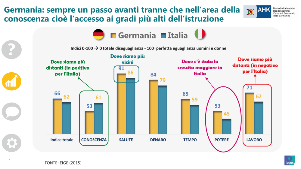 Le donne tedesche, sembra, camminano comunque un metro avanti. 7 su 10 dichiarano di non avvertire alcuna discriminazione e di essere considerate alla pari degli uomini. In Italia, invece, la sensazione è quella opposta: il 74% delle partecipanti ha parlato di una diseguaglianza concreta in termini di diritti sociali, politici ed economici. Questo nonostante il fatto che, proprio nel Bel Paese, le donne riescano ad accedere e conseguire livelli più alti di istruzione.