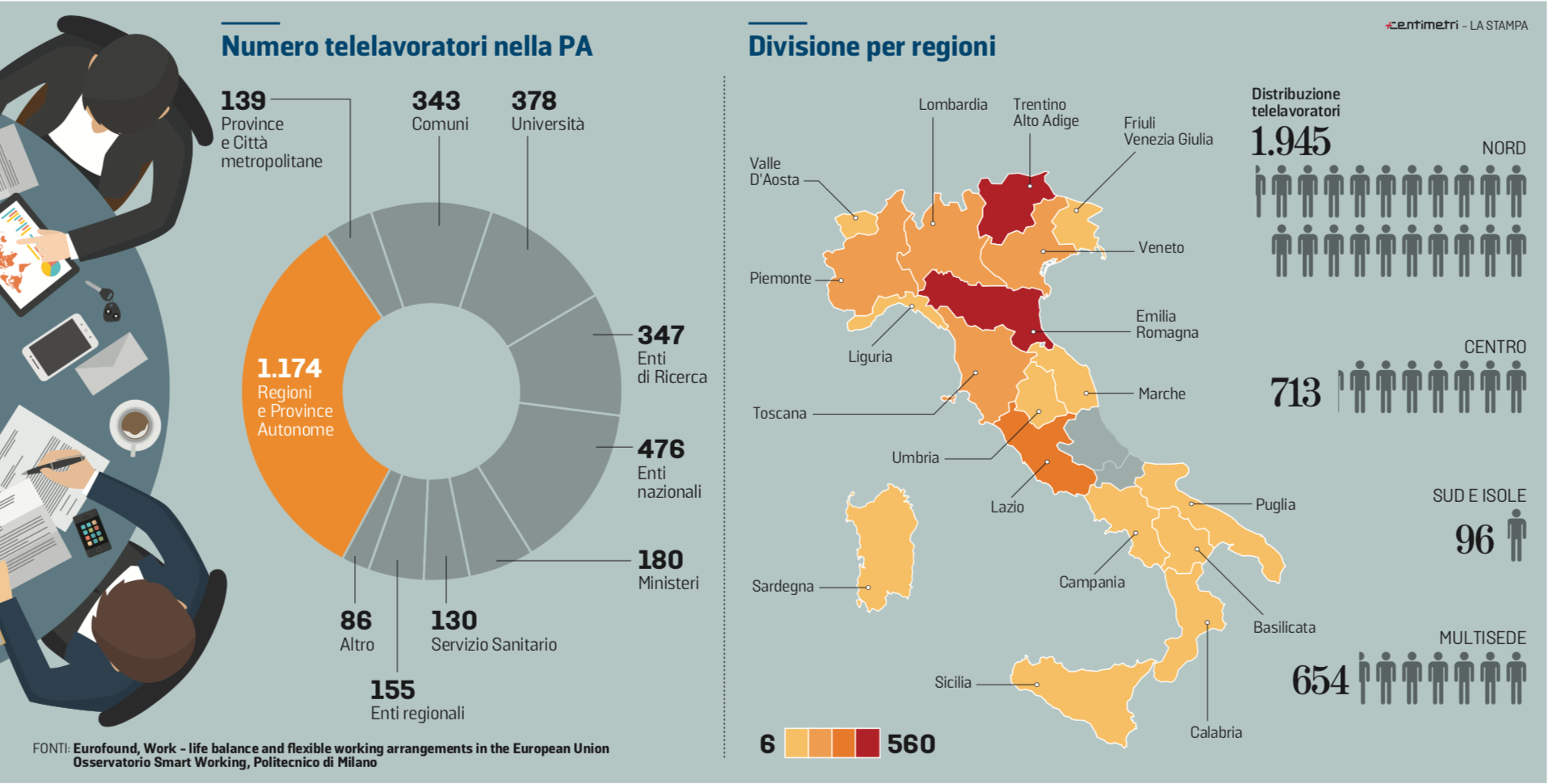 Lo smart working però coinvolge ancora solo il 5% dei lavoratori (circa 305.000) e il 9% delle grandi aziende (meno di una su dieci) sul territorio nazionale. Nonostante i benefici del lavoro agile, tra cui quello di combattere il gender gap occupazionale e aiutare i car giver (perloppiù donne), le piccole e medie imprese e la pubblica amministrazione non hanno ancora attivato misure efficaci di smart working. Secondo la legge Madia del 2015, proprio questi settori avrebbero dovuto rendere agile il 10% dei propri dipendenti nei primi sei mesi del 2018, ma siamo ancora poco sopra lo 0,3%.